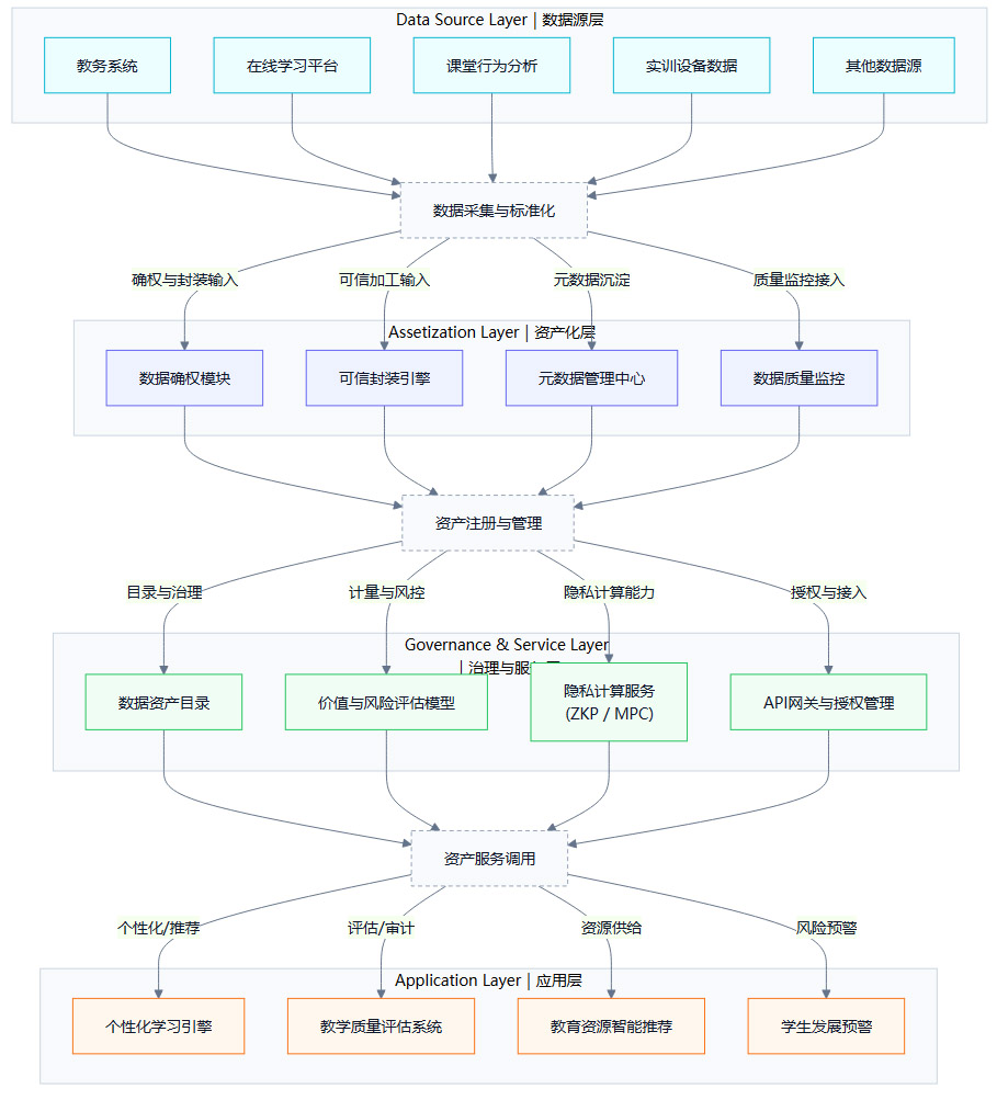 应用层 (Application Layer):上层应用通过调用服务层的API来使用数据资产,实现个性化学习、教学评估等具体业务。应用本身不直接接触原始数据,而是消费经过授权和处理的数据服务。