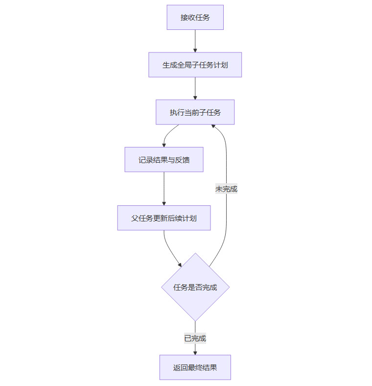 在实现上,父任务节点会维护一个结构化计划字段,其中记录按序编号的子任务列表以及每个子任务的状态,例如未开始、进行中或已完成。每次子任务执行结束,父任务会根据最新信息更新这一计划,可以删除已完成条目,也可以插入新的子任务,甚至可以重写后半段路线,整个过程对模型是自然语言层面的思维更新,对系统则是结构化的状态变更。