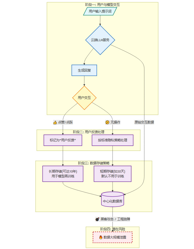 这个流程清晰地揭示了,即使用户本意只是想帮助改进模型,其行为却可能无意中将自己的隐私数据送入了一个长期、高风险的存储池。