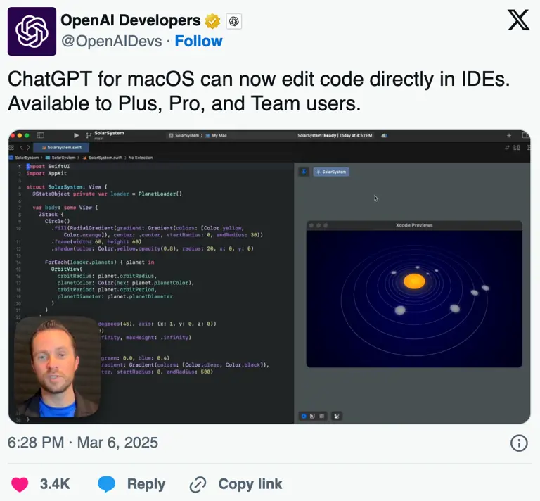 OpenAI于本周四宣布,针对macOS平台的ChatGPT应用重磅更新,新增原生集成Xcode、VS Code等主流IDE的代码编辑能力。此次升级标志着ChatGPT正式加入苹果Swift Assist与微软GitHub Copilot的AI编程助手战局。