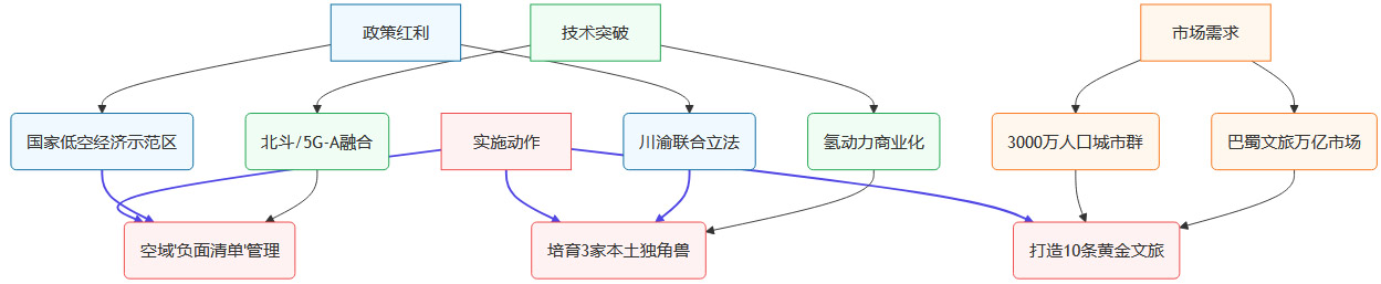 成渝低空经济的未来发展机遇清晰,实施路径明确。以下流程图直观展现了政策、技术、市场和实施动作的协同推进: