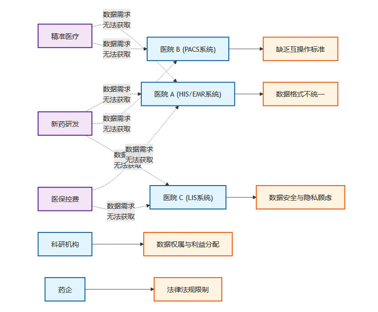 技术壁垒。不同医院在不同时期建设的信息系统(HIS、EMR、PACS等)来自不同厂商,底层架构、数据标准、编码体系千差万别,天然就不具备互通性。