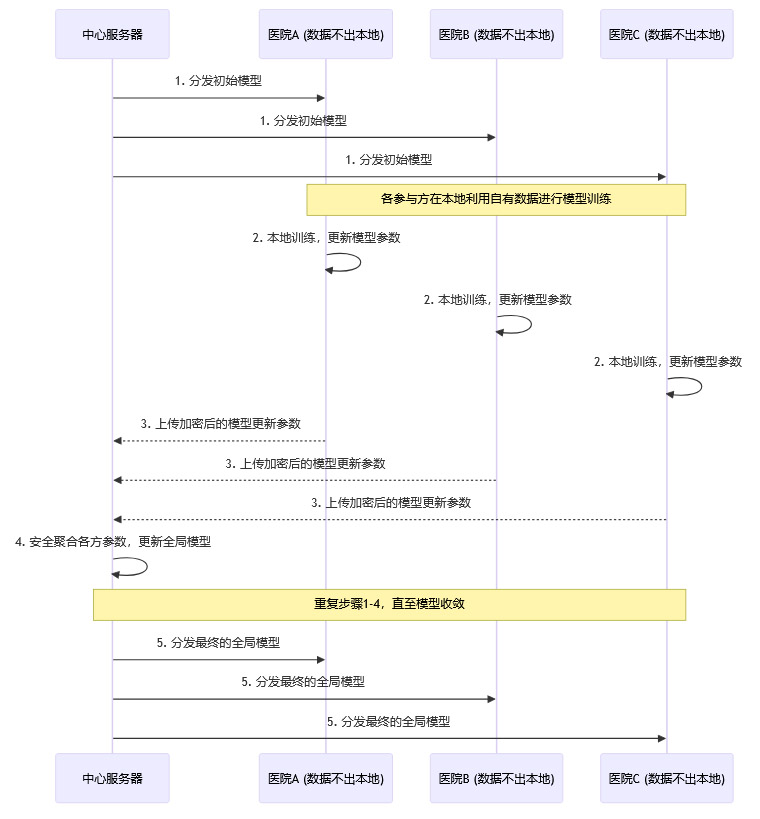 在这个过程中,原始数据始终保留在各自的医院里,从未离开。参与方之间交换的,仅仅是经过加密处理的模型参数(一堆无法反推出原始数据的数字),从而在源头上杜绝了隐私泄露的可能。