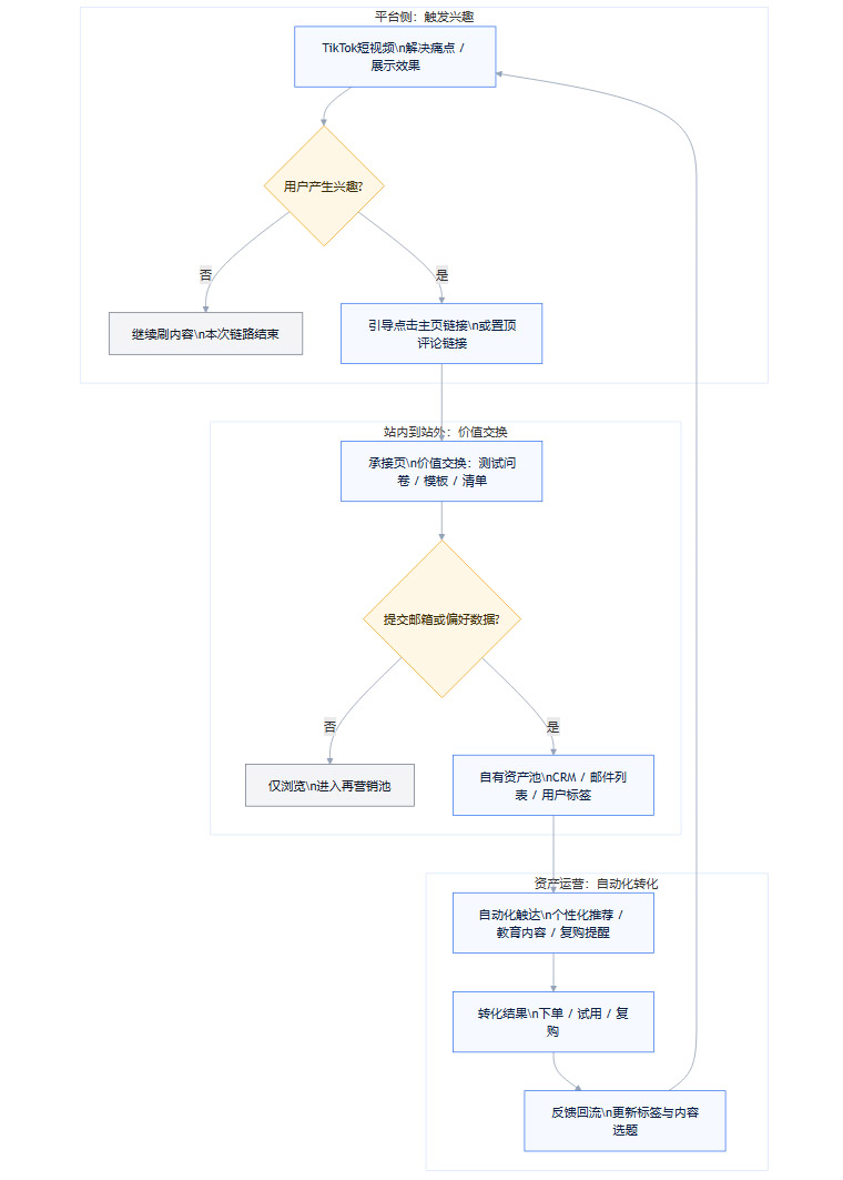 策略:TikTok视频是漏斗的入口,其最终目标是将公域流量引导至品牌的私域资产池。