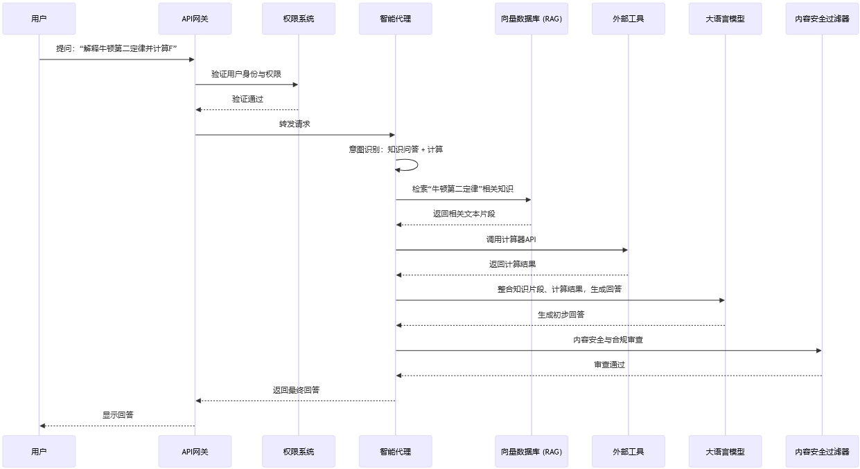 这个流程展示了从用户提问到系统响应的全过程,其中**智能代理(Agent)**是核心,它负责调度RAG、工具调用和LLM,共同完成复杂的教学任务。