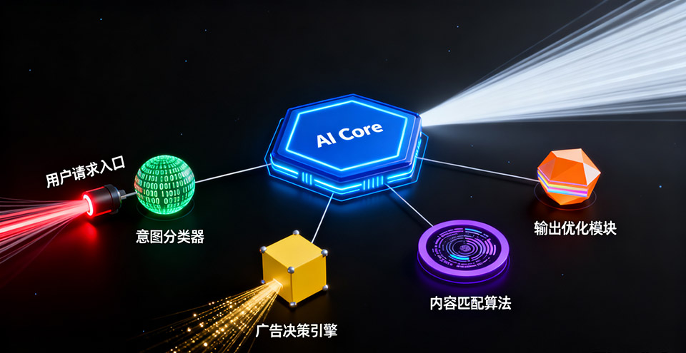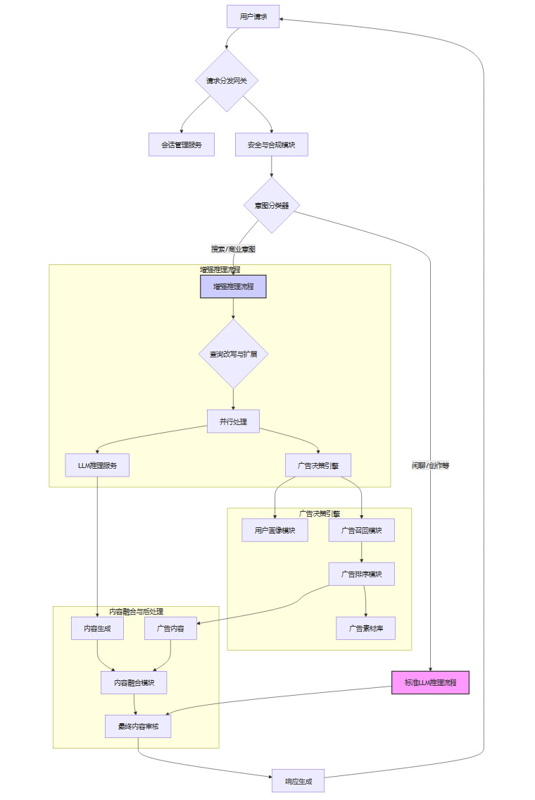 这个架构的核心在于引入了一个“意图分类器”,它作为流量的第一个分拣站,判断用户请求是否具有商业潜力。对于被识别为具有商业意图的请求,系统会启动一个包含广告决策引擎的“增强推理流程”。