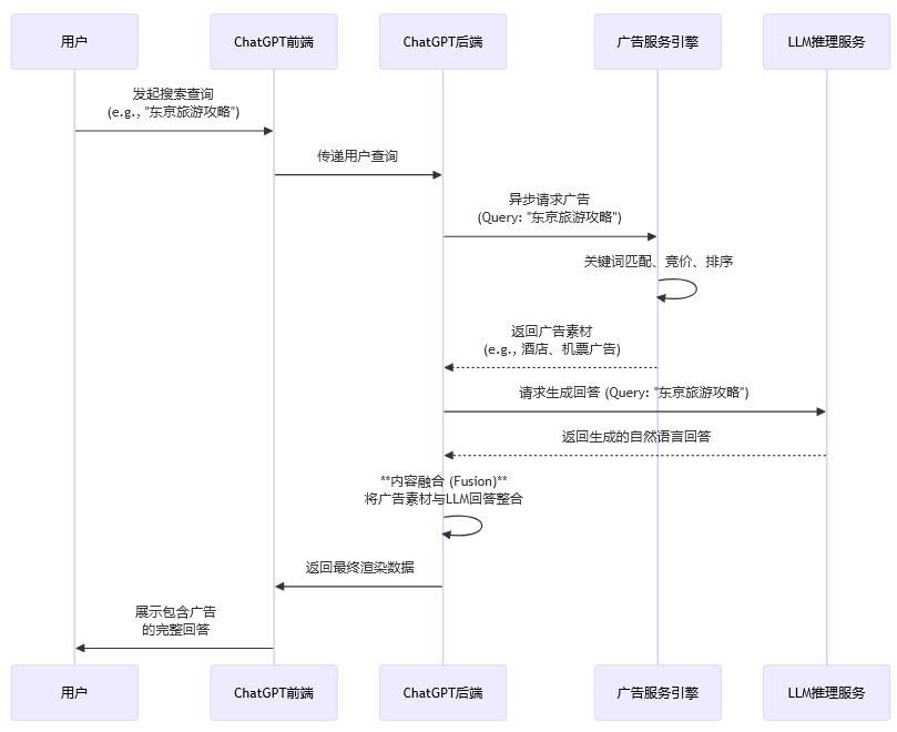 此流程的关键技术点在于内容融合(Fusion)。后端服务需要在不破坏LLM生成内容完整性和逻辑性的前提下,智能地将广告素材插入到合适的位置。同时,为了保证响应速度,广告请求与LLM推理通常需要并行处理。