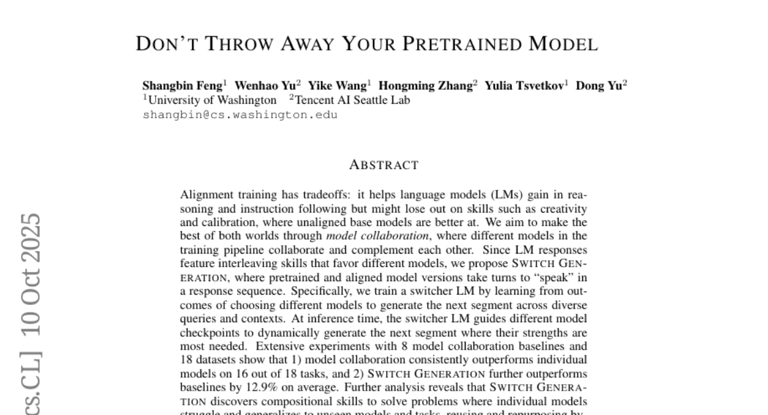 【摘要】介绍一种名为“切换生成”的多模型协作范式。该体系通过智能调度,让预训练、微调与对齐模型在生成任务中分工接力,有效突破了单一对齐模型的性能瓶颈,实现了集体智慧。