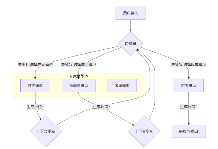 切换器(Switcher):一个额外训练的、小型的分类模型。它不负责生成任何内容,其唯一职责是在生成过程的每一步,决定“下一段话由哪个专家模型接棒”。它扮演着“智能路由器”或“指挥官”的角色。