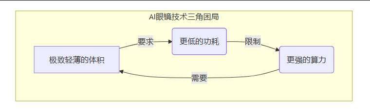 AI眼镜的技术发展,始终被一个难以调和的“三角困局”所束缚,那就是功耗、算力、体积。