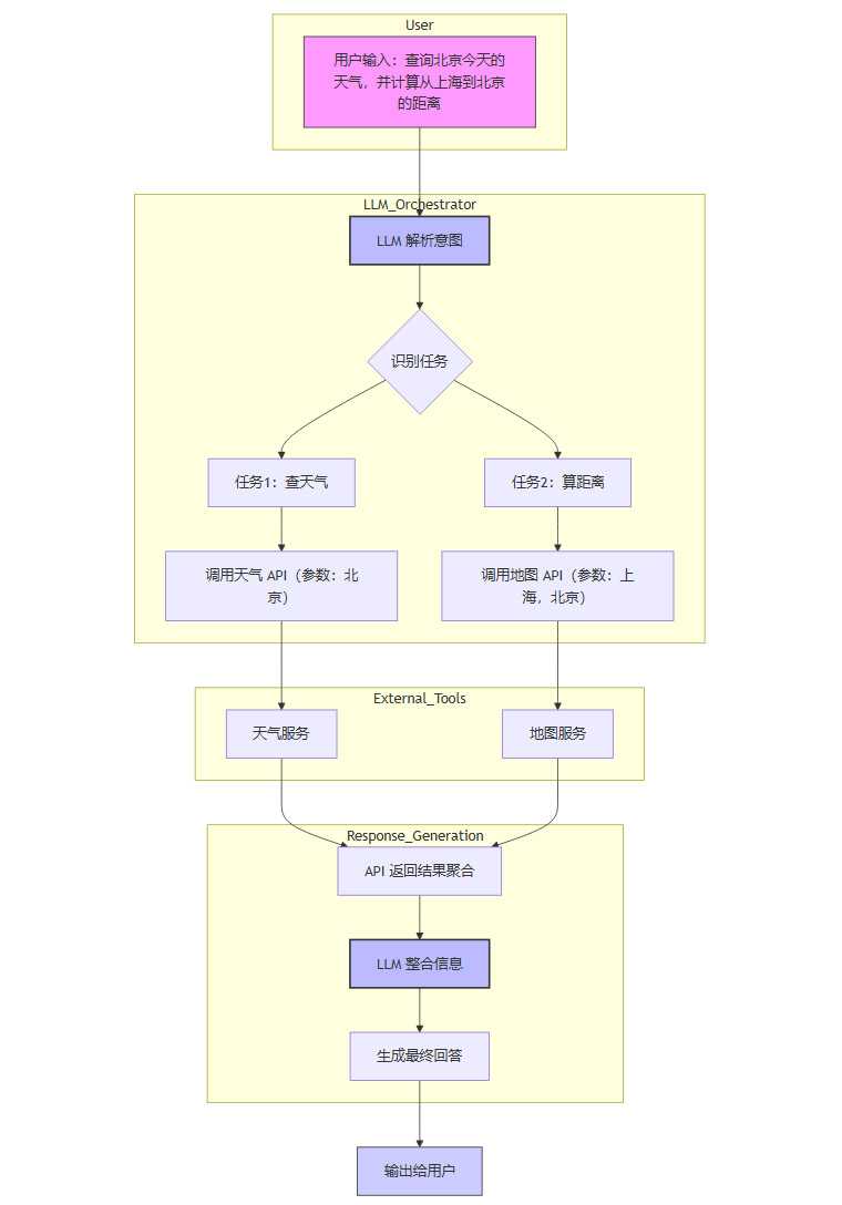 如上图所示,模型不再亲自“计算”天气或距离,而是扮演一个理解用户意图、选择合适工具、并组装工具返回结果的角色。