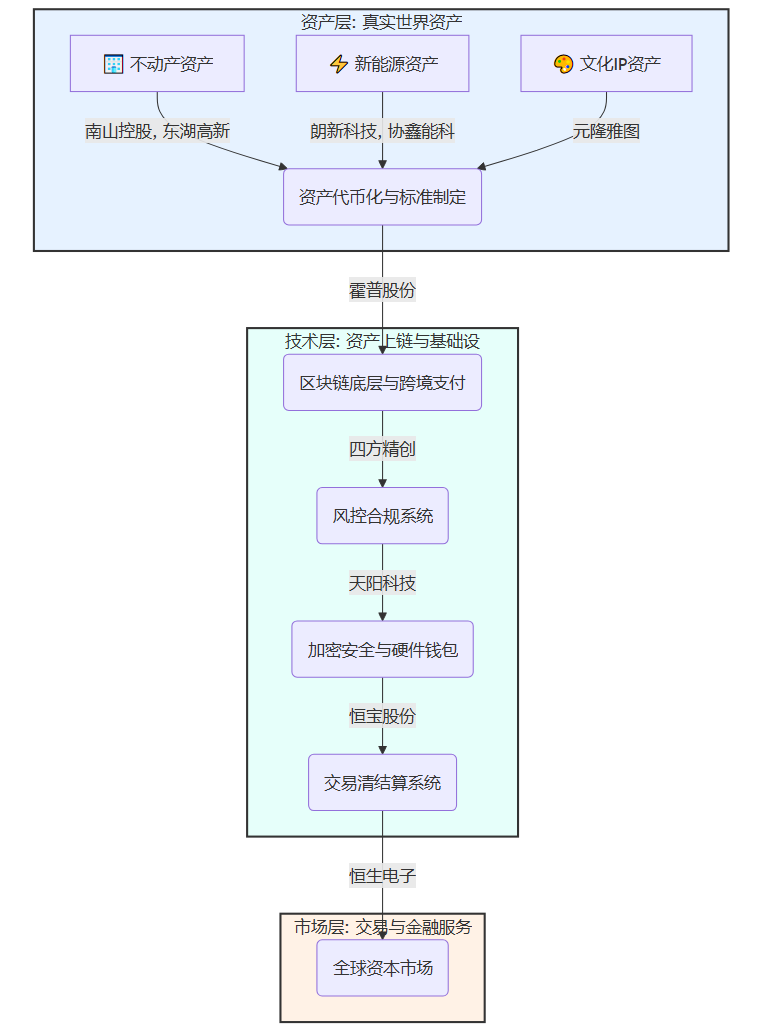 技术层的“层层加固”:技术层并非单一环节,而是一个环环相扣的“安全链条”。从霍普股份制定的上链标准开始,到四方精创提供的底层链与支付通道,再到天阳科技嵌入银行系统的风控逻辑,最后由恒宝股份提供硬件级的安全保障,共同构筑了RWA资产安全流转的技术护城河。