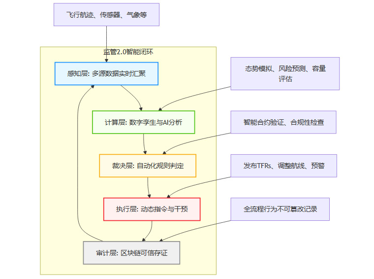 “监管2.0”模式彻底颠覆了传统线性流程,构建了一个**“感知—计算—裁决—执行—审计”**的智能化、自动化闭环系统。这个闭环是新一代监管体系的“操作系统”,确保空域管理能够实时适应环境变化。
