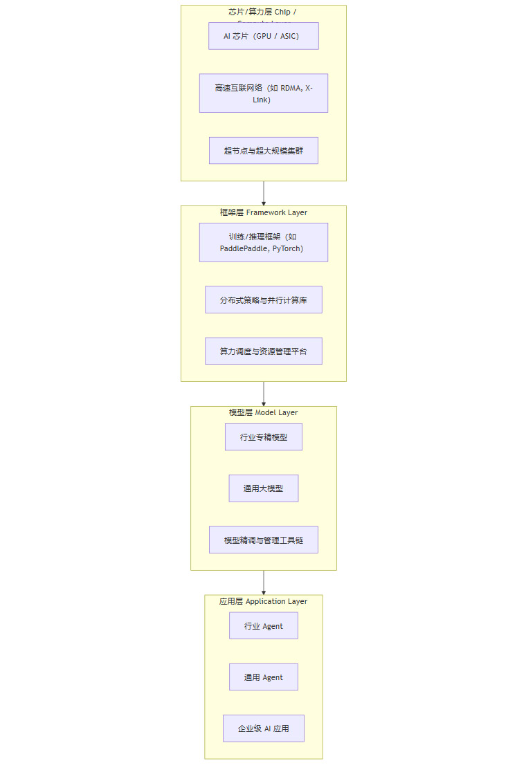框架层:这是连接硬件与算法的桥梁。它负责将上层的模型训练和推理任务,高效地翻译成底层硬件可以执行的指令,并进行大规模分布式调度。