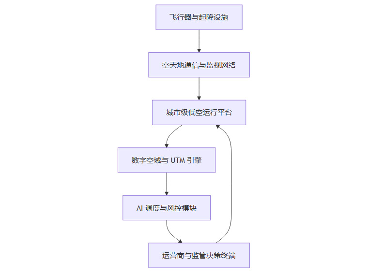 从图中可以看到,终端、网络、平台和智能引擎构成了一个闭环,飞行器状态和环境数据通过网络上传到城市平台,经由数字空域和 UTM 引擎进行资源分配和冲突检测,再交由 AI 模块做优化与风险评估,最终呈现在运营商和监管席位上,反向通过平台下发指令,形成持续迭代的运行和决策循环。
