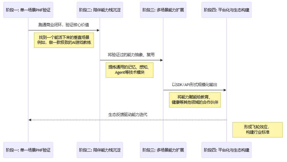 这个路径的核心思想是,先做深,再做广。不要一开始就试图构建一个大而全的通用陪伴平台,而是从一个极度垂直的场景切入,用“陪伴能力”解决该场景下的一个真问题,并跑通商业模式。在此基础上,再将验证过的能力沉淀、抽象,并逐步扩展到其他领域,最终形成平台化的生态。