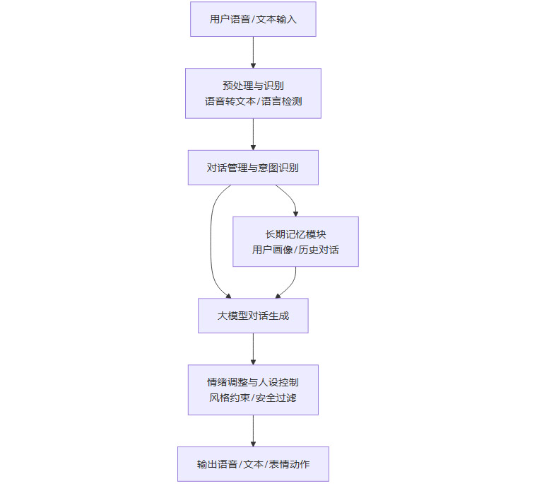 从技术栈看,情绪类 AI 的典型架构可以用一个简化流程表示。