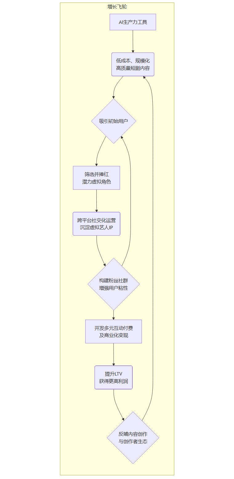 AI驱动的生产力工具和以虚拟艺人为核心的IP资产,共同构成了一个全新的增长模型。这个模型不再依赖单一的买量驱动,而是形成了一个内部可循环、可持续增长的“飞轮”。