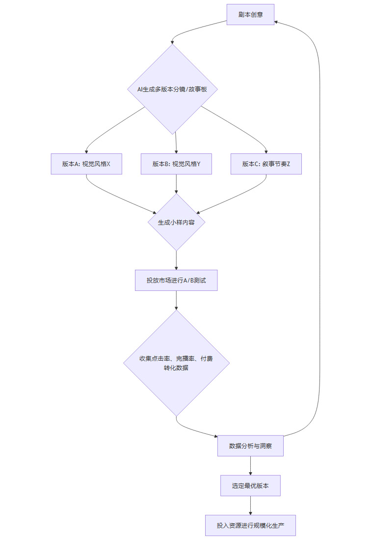 上图展示了AI驱动下的“多版本测试-数据选优”流程。平台可以在正式投入制作前,用极低的成本生成多个包含不同视觉风格、叙事节奏、角色设定的内容小样(Clip),并进行小范围投放测试。依据真实的市场数据反馈来指导最终的创作决策,而不是依赖少数人的主观判断。这套方法论,将互联网产品的精益创业思想,成功引入了内容创作领域,极大提高了爆款出现的概率,同时有效规避了资源浪费。