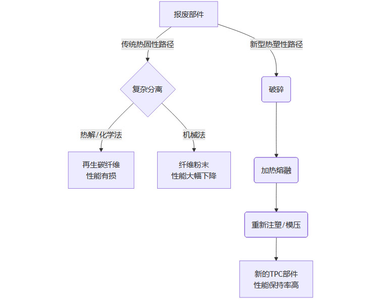 如上图所示,TPC的回收路径显然更短、更高效。通过简单的机械破碎和加热重塑,回收率可以轻松超过90%,而再生纤维的强度保留率也能达到85%以上。这不仅大大降低了回收的难度和能耗,还使得再生材料能够被重新用于制造高性能的结构件,实现了真正意义上的“闭环回收”。