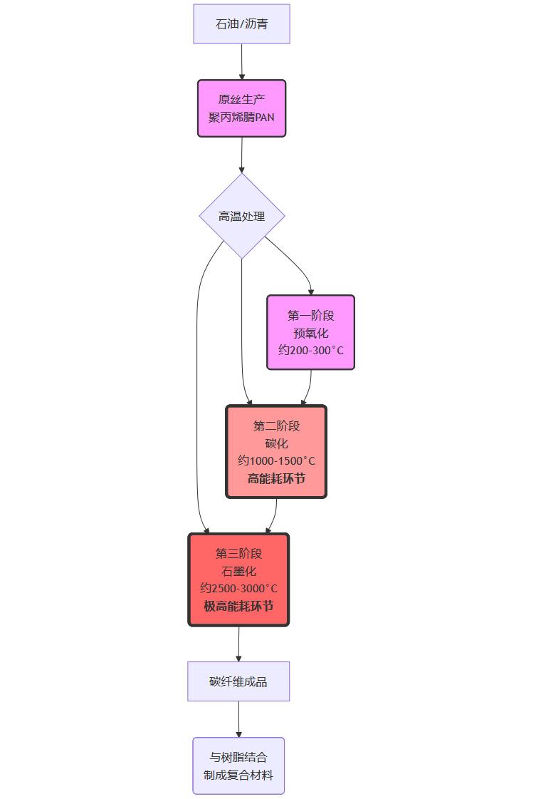 上图清晰地展示了碳纤维的生产过程。从原丝(主要是聚丙烯腈,即PAN)的制备,到经历数千摄氏度高温的碳化和石墨化处理,每一步都需要消耗大量的电力。如果生产这些电力的来源是化石燃料,那么制造CFRP的过程就会产生惊人的间接碳排放。