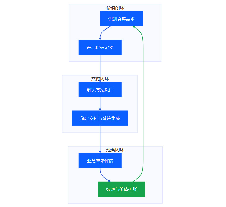 “商业可行”阶段,团队关注的是“客户愿不愿买,能不能用起来,以及用完后是否会持续付费”。这是一个完整的商业闭环,它要求技术深度融入业务流程。