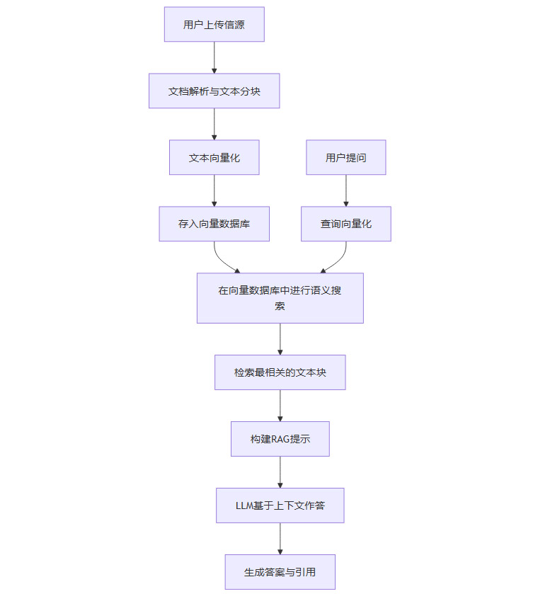 知识库构建:用户首先上传自己的资料。NotebookLM会对这些文档进行解析,将其分割成较小的文本块(Chunks),然后使用一个Embedding模型将每个文本块转换为一个高维向量,并存入专门的向量数据库中。这个过程相当于为用户的个人知识建立了一个可供语义检索的索引。