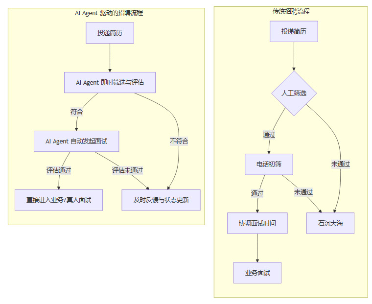 下面是一个简化的流程对比图,展示了 AI Agent 如何重构招聘流程。