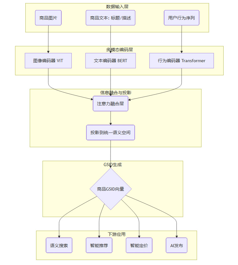 GSID的核心思想,是将不同模态的信息编码到同一个高维语义空间(Embedding Space)中。在这个空间里,语义相近的商品、搜索词、用户兴趣等,其对应的向量在空间中的距离也相近。这为后续的精准匹配、召回和推荐奠定了数学基础。