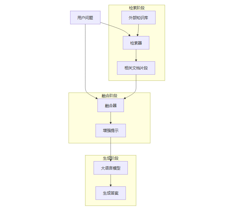 RAG的整个工作流程可以被清晰地划分为三个核心阶段,即检索(Retrieve)、融合(Augment)和生成(Generate)。这三个阶段环环相扣,构成了一个完整的知识增强闭环。