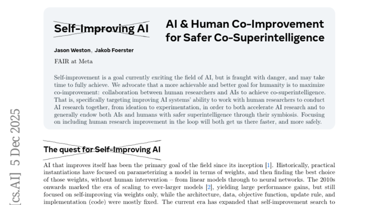 近期,Meta FAIR实验室的Jason Weston与Jakob Foerster在论文(arXiv:2512.05356v1)中,对这一主流范式提出了系统性反思。他们并未否定自我改进的潜力,而是提出了一条截然不同的实现路径——“人机共同改进”(Human-AI Co-Improvement)。其核心主张是,与其急于将人类从研究循环中剔除,不如刻意将AI设计成能够与人类研究者高效协作的“研究伙伴”。