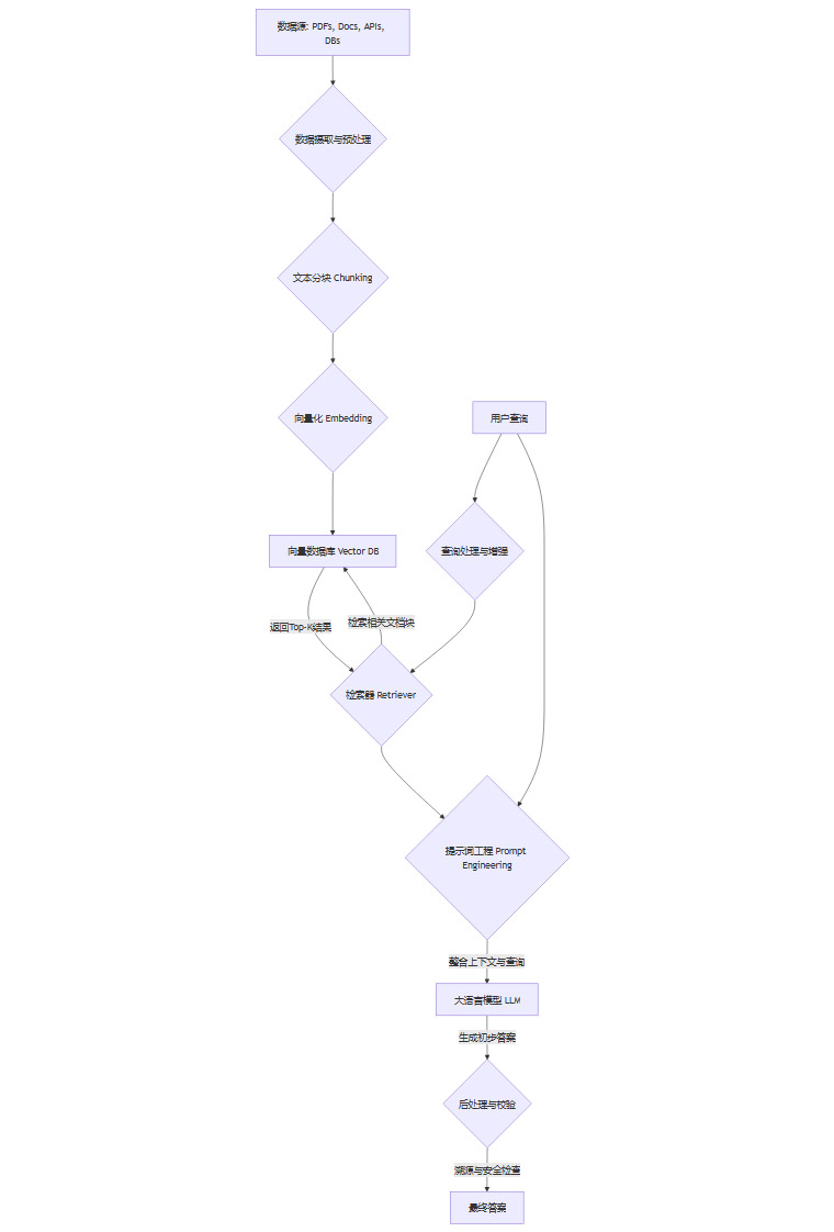 这套架构已经成为企业适配私有数据的标准模式。它的成功,依赖于一个由多个精密部件构成的复杂系统。我们可以通过一个简化的流程图来理解这个系统。