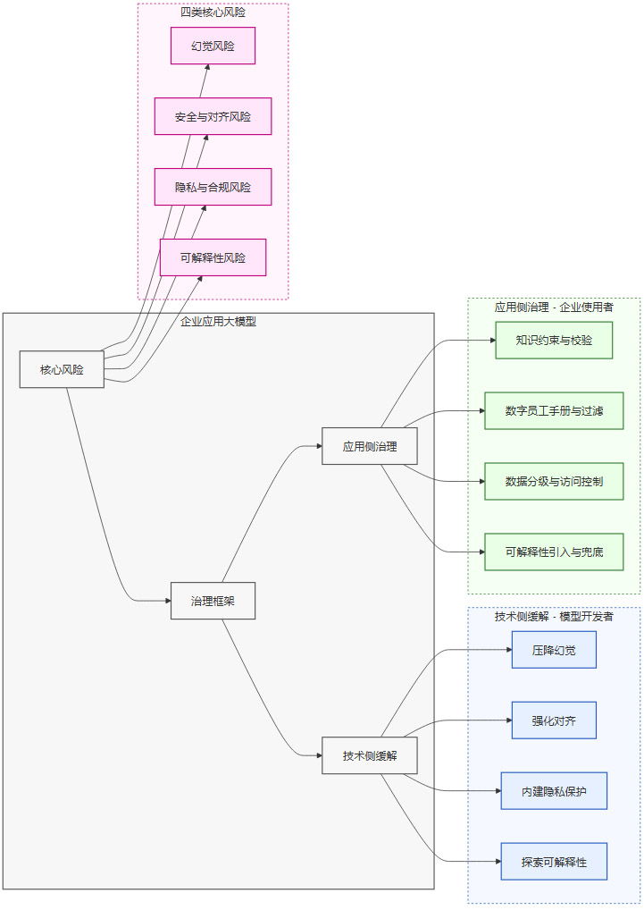 面对上述四类风险,企业不能坐等技术完美,也不能因噎废食。有效的风险治理需要一个双轮驱动的框架,即技术侧缓解与应用侧治理并行。