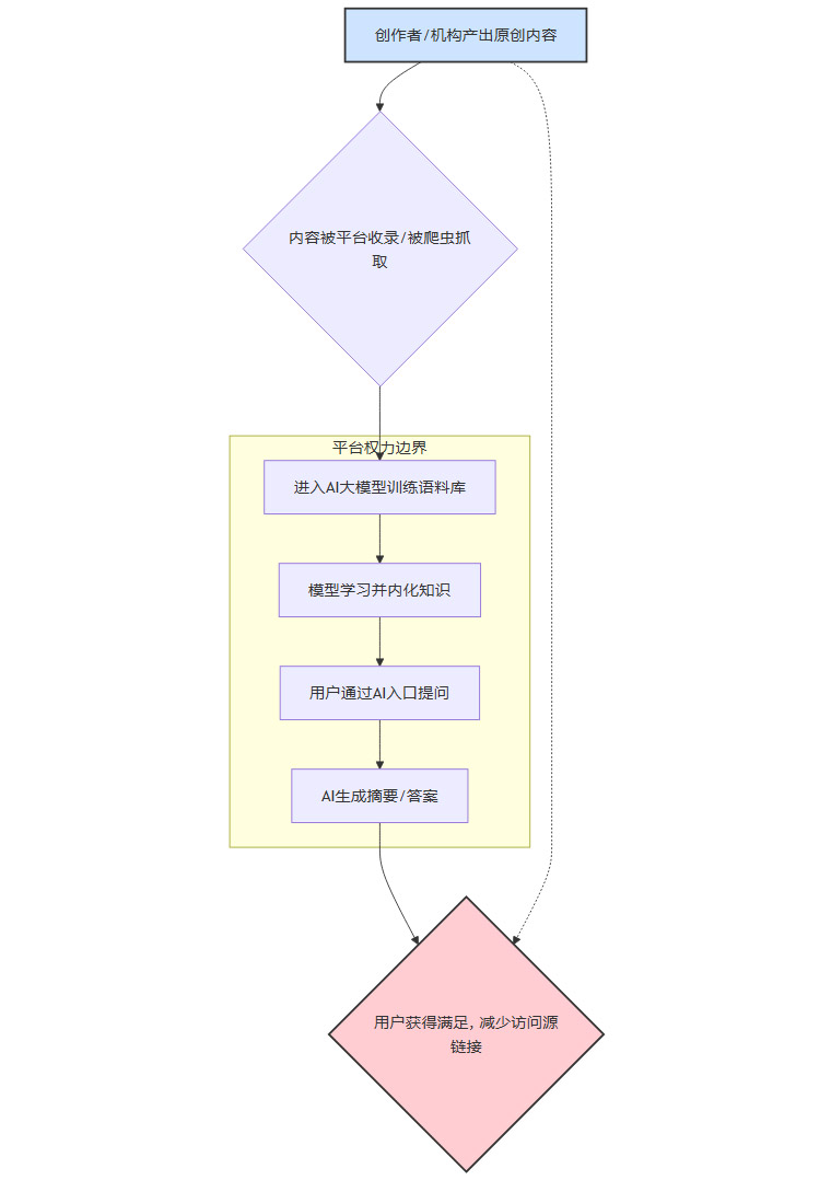 流量截断:用户通过AI直接获取答案,访问原创内容网站的流量大幅减少。这直接冲击了以广告或订阅为主要商业模式的媒体机构和独立创作者的生存根基。