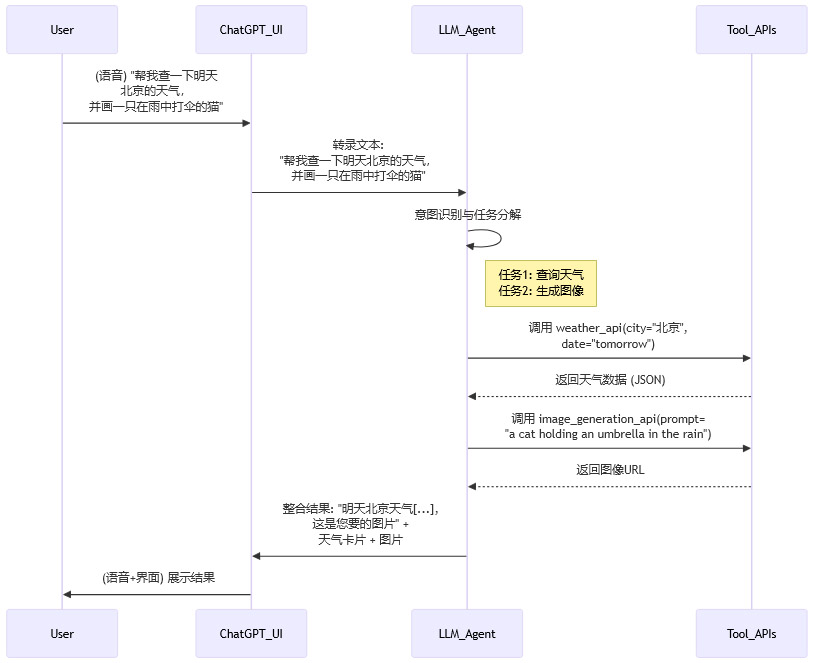 新版语音交互的强大之处,在于它不仅仅是聊天,更是一个通过自然语言驱动复杂任务的控制中枢。这背后是大模型作为代理 (Agent) 的工具调用能力。