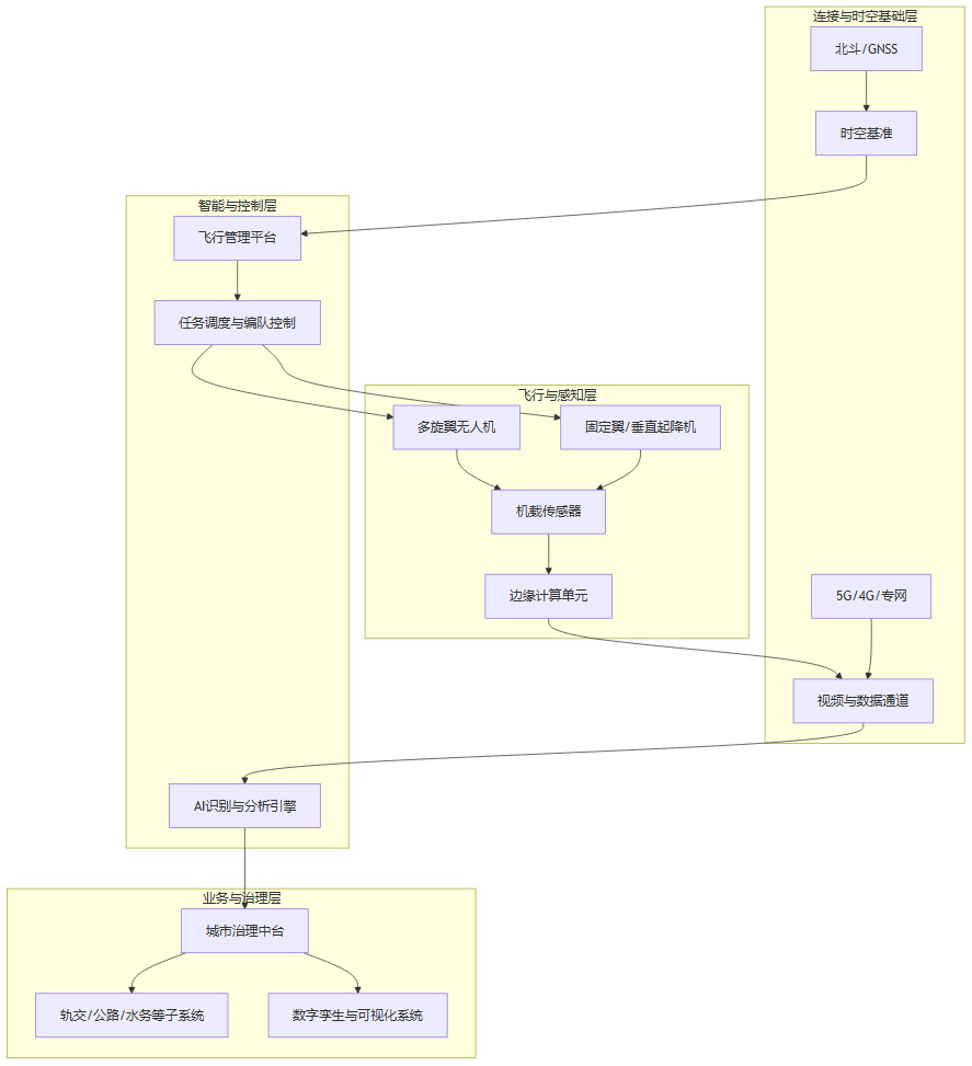 可以用一个简化架构图来概括一个典型城市级低空+AI平台。