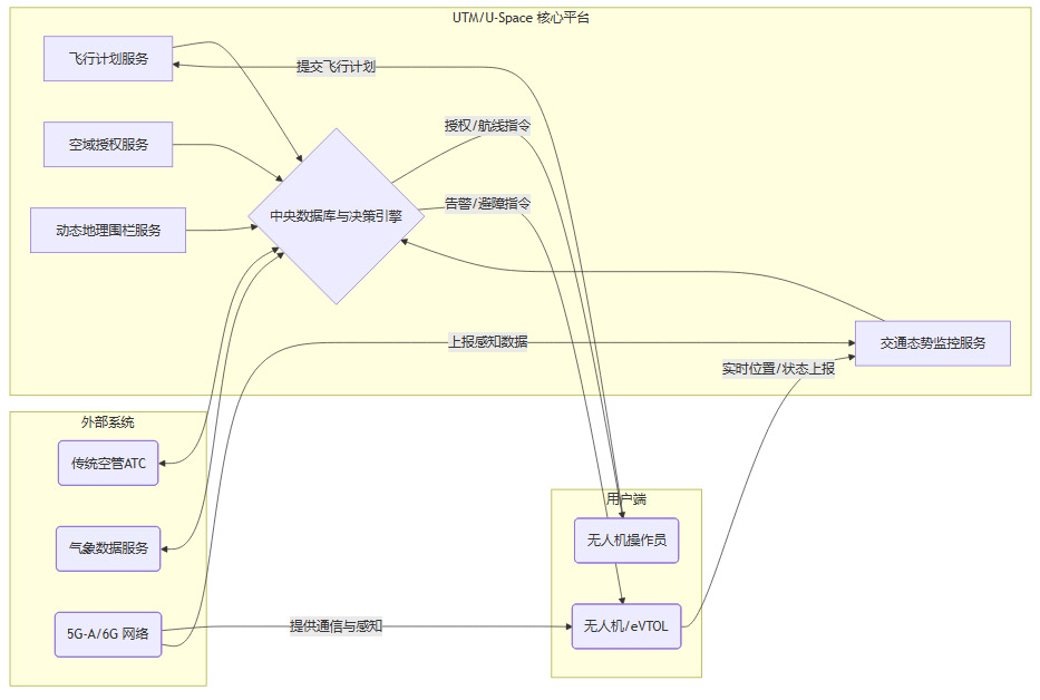 这个架构清晰地展示了UTM如何通过中心化的平台,对所有低空飞行活动进行注册、规划、监控和调度,从而实现空域的精细化、数字化管理。