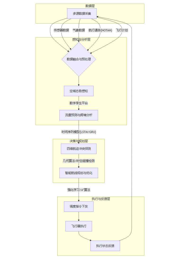 云(Cloud):作为“大脑”,云端平台负责处理海量的时空数据,进行大规模的交通流量仿真、飞行器健康状态预测模型的训练,以及长周期的空域资源规划。