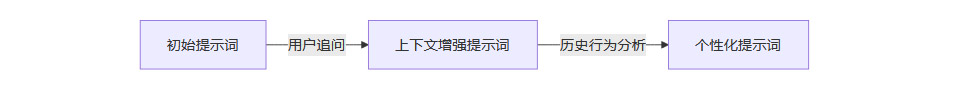 动态提示词的生成与演进,通常遵循“初始—上下文增强—个性化”三级体系。其流程如下: