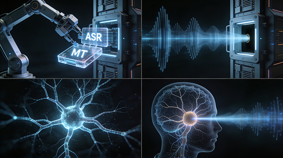 语音翻译技术正处在一个关键的十字路口。长期以来,业界普遍采用**分步流水线(Pipeline)方案,即先通过自动语音识别(ASR)将语音转换为文本,再由机器翻译(NMT)或大语言模型(LLM)完成文本到文本的翻译。这条路径成熟、可控,构成了当前商业应用的主流。然而,随着端到端(End-to-End)思想的兴起,直接从语音输入到目标语言文本输出的语音大语言模型(SpeechLLM)**开始崭露头角,其“一步到位”的理念,理论上能避免级联误差、保留更丰富的语音信息,被视为下一代技术的颠覆者。