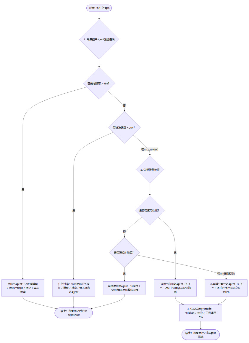 这个流程的精髓在于,它将多智能体协作视为一种高成本的、有特定适用场景的“最后手段”,而不是一个普适的、首选的解决方案。它引导我们优先投入资源去夯实单Agent这个基础,只有在单Agent确实能力不足,且任务特征又高度匹配的情况下,才审慎地引入少量、可控的多Agent协作。