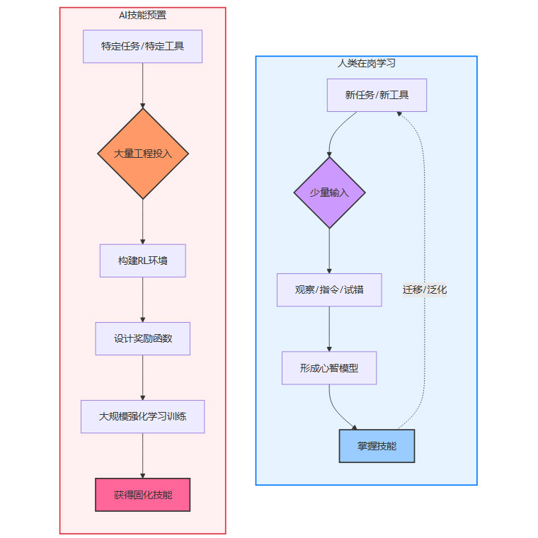 这个流程图直观地表明,AI的“技能预置”是一种重资产、前置化的模式。为了让模型学会一项新技能,就需要投入巨大的工程资源去构建一个专用的训练闭环。这种模式的代价是高昂的,并且其产出的技能是脆弱和僵化的。