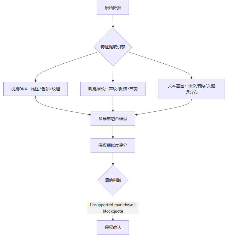 AI通过跨模态融合技术,构建了数字内容的“基因图谱”。视觉DNA、听觉指纹、文本基因三者在多模态融合模型中协同工作,最终输出侵权相似度评分,实现高精度的侵权确认。