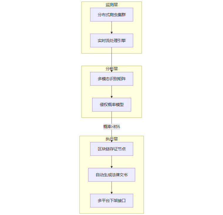 AI与区块链的协同,推动了版权治理的全链路自动化。分布式爬虫集群实时监测内容,AI模型自动比对特征,发现侵权后自动触发区块链取证,完成屏幕录制、操作日志抓取、哈希值生成与上链存证,最终通过预警系统通知权利人,实现了从发现到固证、预警的全流程自动化。