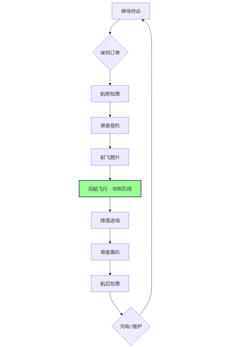 一架eVTOL的运营周期可分解为多个阶段,其中真正产生收入的只有“载客飞行”阶段。我们可以通过一个简化的Mermaid流程图来观察其低效环节。
