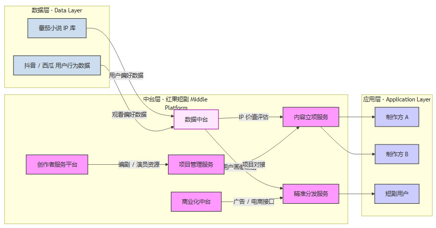 红果短剧的分账创新并非孤立存在。将其置于字节跳动的整体内容生态中,一个更为宏大的技术架构浮出水面。这是一个由数据层、中台层和智能层构成的、高度协同的增长飞轮。