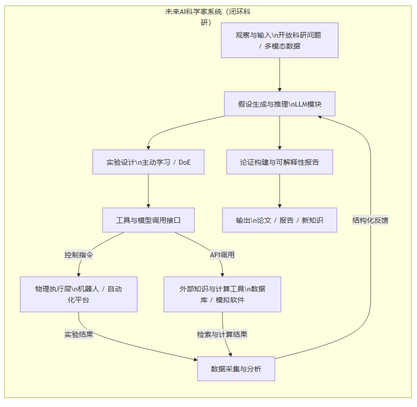 我们可以用一个更复杂的流程图来描绘这种未来“AI科学家”系统的工作模式。
