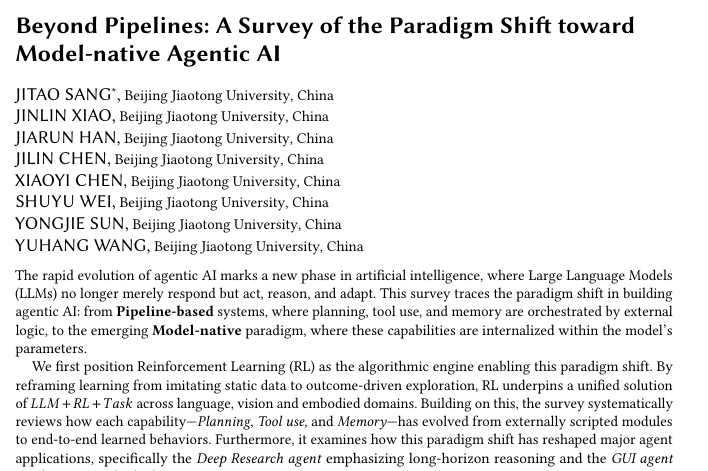 【摘要】AI智能体正从依赖外部脚本的“流水线”范式,转向将规划、工具使用与记忆能力内化为模型参数的“模型原生”范式。强化学习是驱动这一架构重塑的核心引擎。
