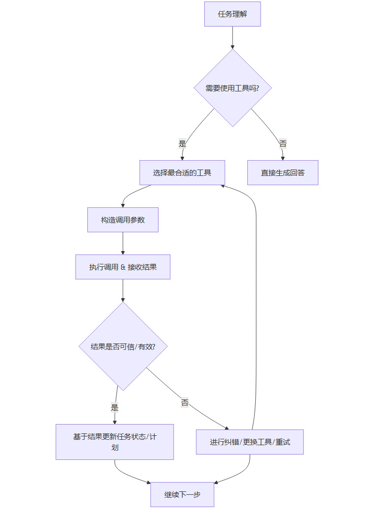 结果判断与闭环纠错。这是最关键的一步。模型需要评估工具返回结果的质量,判断其是否符合预期、是否存在错误。如果结果有问题,模型需要具备自主纠错的能力,例如更换工具、修改参数重试,或者调整后续的计划。