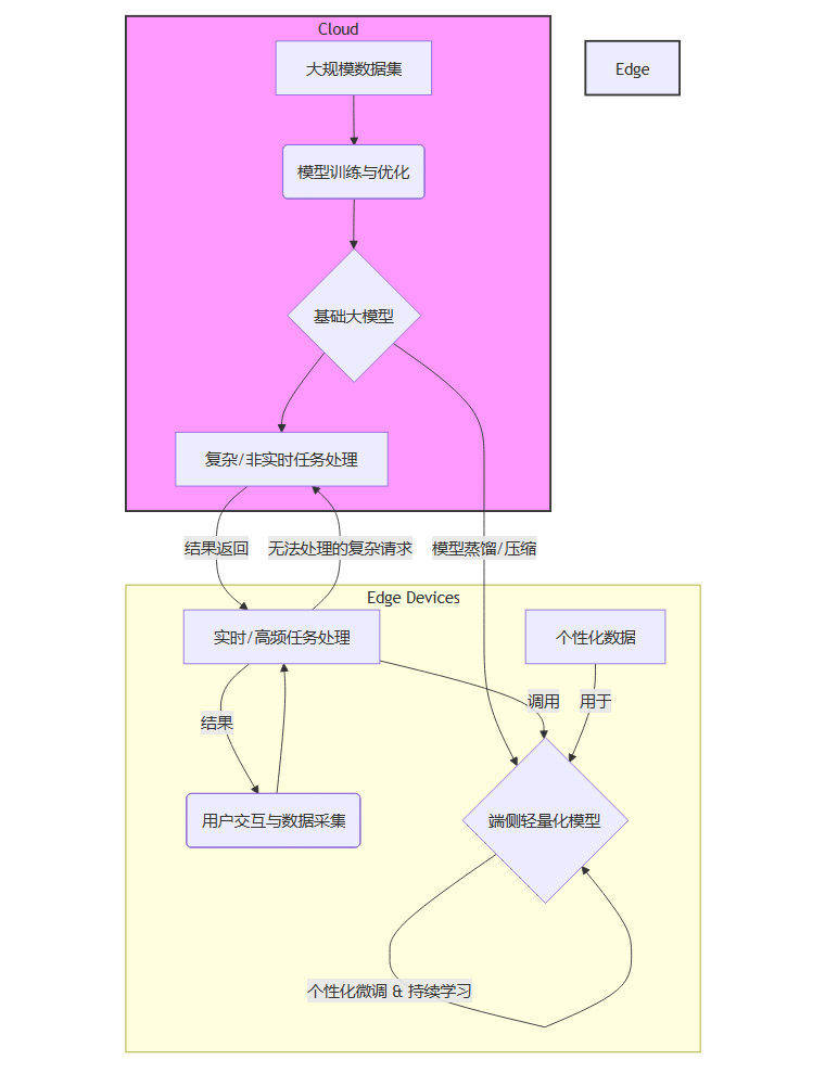 端侧AI并非要完全取代云端。最理想的架构是一种端云协同(Edge-Cloud Collaboration)的混合模式,它兼顾了双方的优势,形成一个有机的整体。